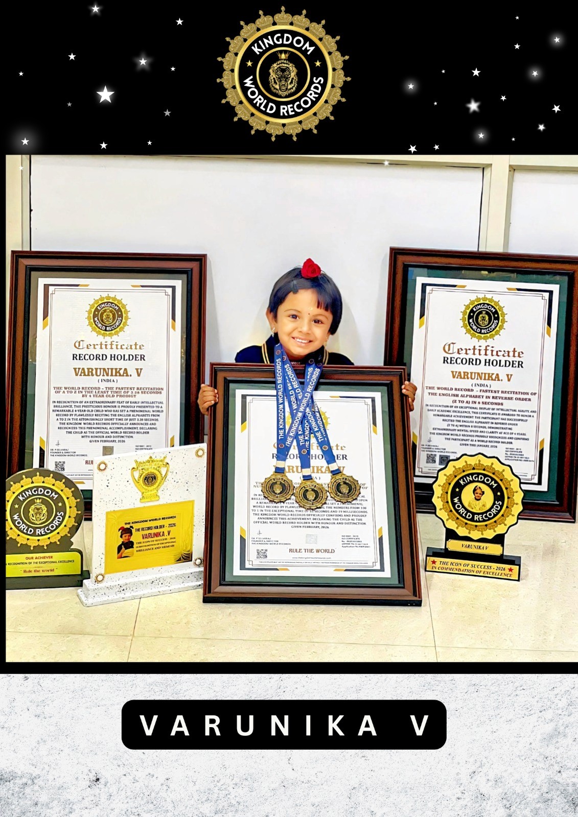 THE WORLD RECORD – VARUNIKA. V - FASTEST REVERSING OF NUMBERS FROM 100 TO 1 IN THE LEAST TIME OF 55 SECONDS AND 19 MILLISECONDS BY 4 YEARS OLD