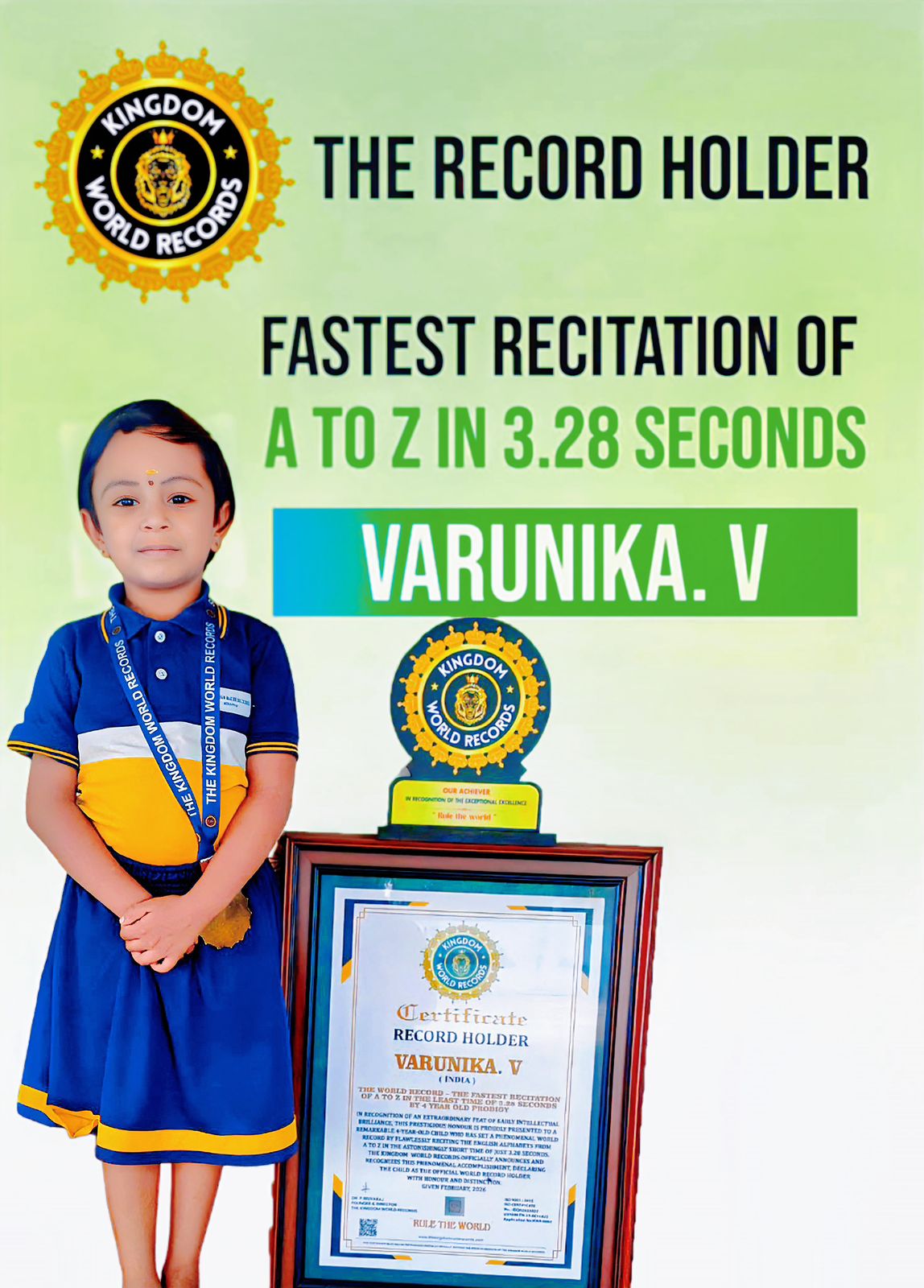 THE WORLD RECORD – VARUNIKA. V - THE FASTEST RECITATION OF A TO Z IN THE LEAST TIME OF 3.28 SECONDS BY 4 YEAR OLD